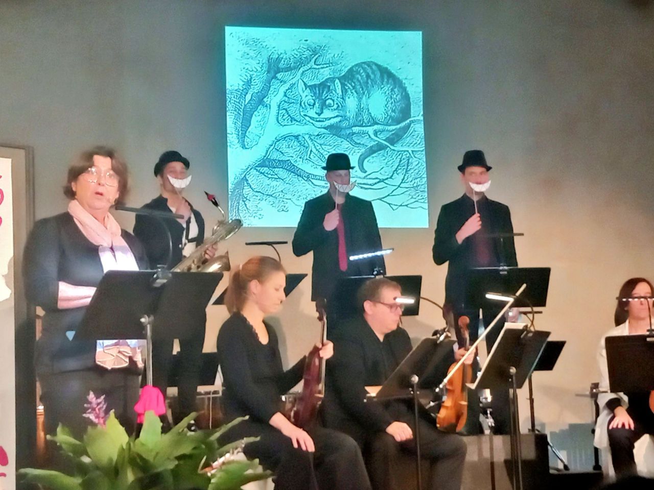 Il y avait 10 musiciens et une narratrice. Il y avait des images de l'histoire projetées sur un mur. Des musiciens se déguisaient pour jouer les personnages de l'histoire.
