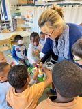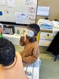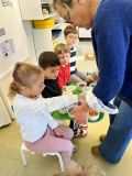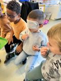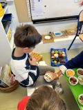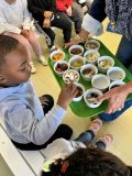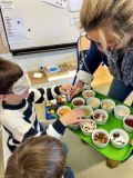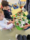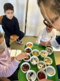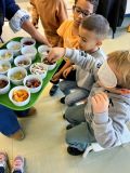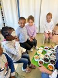 Nous avons beaucoup aimé goûter à tout ce qu ‘ il y avait sur le plateau ! Il fallait deviner , lrs yeux bandés , ce qu on mangeait !
